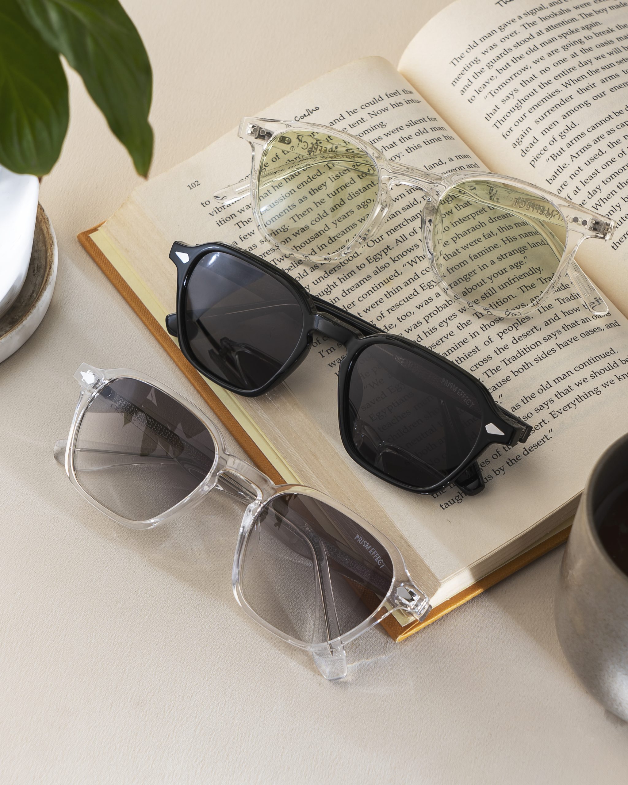 • Design: Transparent crystal frame with subtle tinted lenses for a modern, versatile look