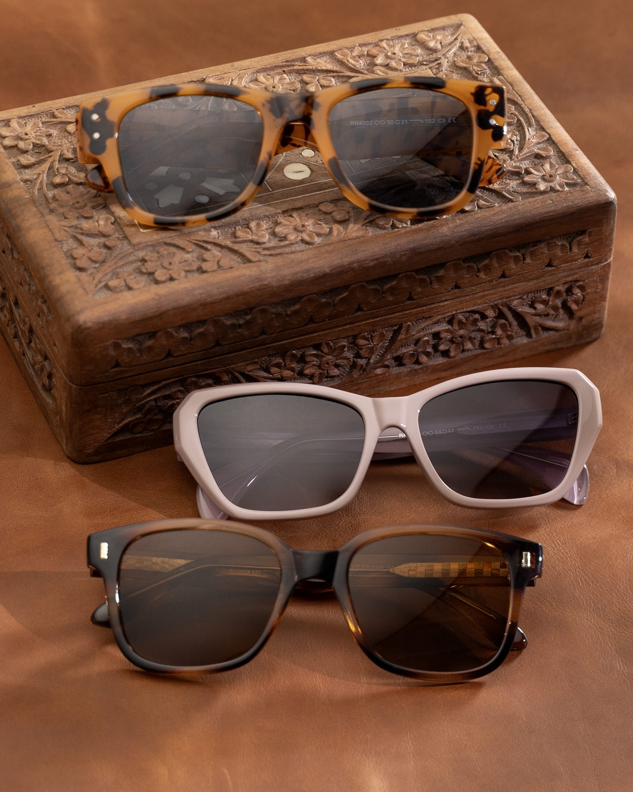 Bottom Pair: Sleek, rectangular sunglasses in a dark brown/black tortoiseshell finish. The frame is most likely acetate, valued for its strength and glossy finish. The dark lenses provide UV protection and a timeless, sophisticated look.